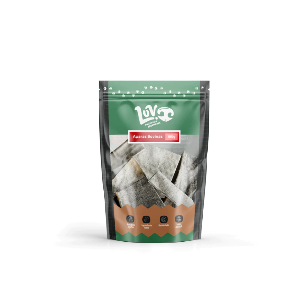 Apresentamos as Aparas de Pele Bovina Luv! Cada pacote contém 150 gramas de pele de bovino desidratada, garantindo de 4 a 6 unidades para o deleite do seu melhor amigo. Feitas com 100% de ingredientes naturais, essas delícias são a escolha ideal para cães saudáveis de porte médio e grande.