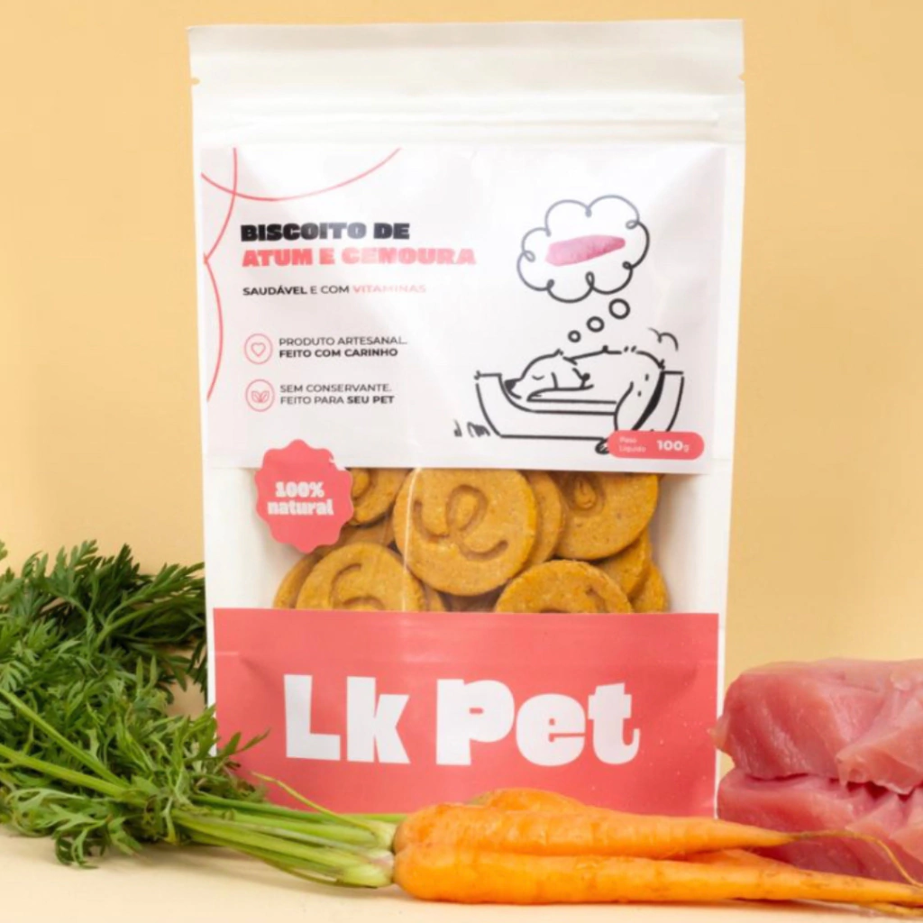 Descubra o Petisco Biscoito de Atum e Cenoura (100g) Lk Pet, um snack funcional e artesanal feito com ingredientes naturais como atum, cenoura, aveia, quinoa e azeite de oliva. Livre de conservantes, é crocante, nutritivo e repleto de vitaminas essenciais para cães de todas as idades e raças.
