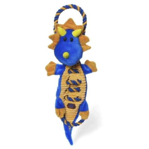 Petstages Ropes A Go-Go Dragon Blu é um brinquedo feito com cordas que entram e saem de uma pelúcia reforçada com K9 Tuff Guard, que é nylon ultra durável reforçado por dentro. Fofo por fora e forte por dentro. Possui apitos pelo corpo e estalidos que estimulam os instintos dos cães. Costuras duplas para durabilidade extra. Cuidados: Brinquedo feito exclusivamente para cães. Mantenha fora do alcance das crianças. Quando escolher um brinquedo, certifique-se de escolher o melhor tamanho para seu cão. Nenhum brinquedo é indestrutível. Sempre supervisione o uso do brinquedo com seu cão a todo momento. Inspecione o produto sempre antes do uso. Rasgos ou pedaços soltos podem machucar o seu cão. Se danificado deve ser descartado. Use interativamente. Nunca deixe sozinho com o cão. Não é feito para roer ou ser repuxado. Brinque interativamente com seu cão. Acabada a brincadeira, guarde para a próxima.