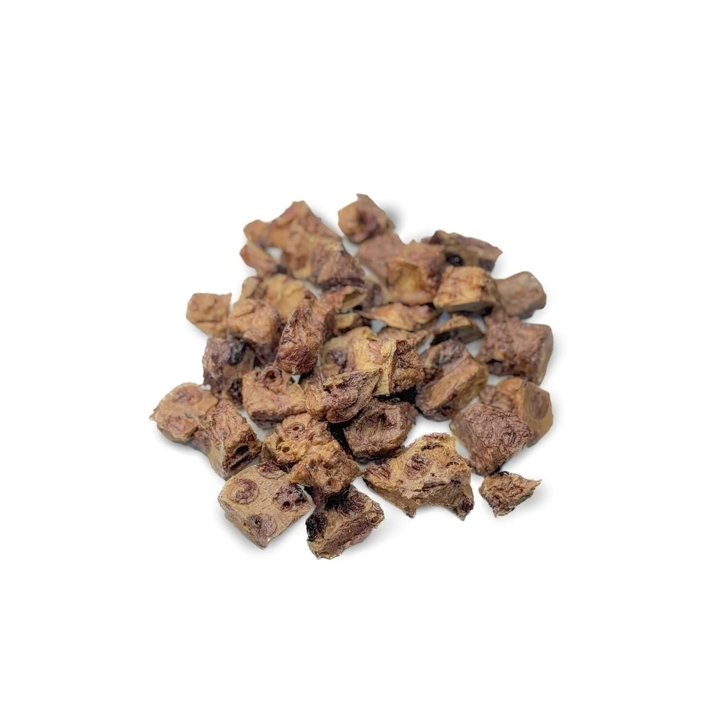 Petisco 100% natural, feito com ingrediente de origem animal e desidratado lentamente em temperatura controlada garantindo maior durabilidade e conservação do produto sem uso de químicos.