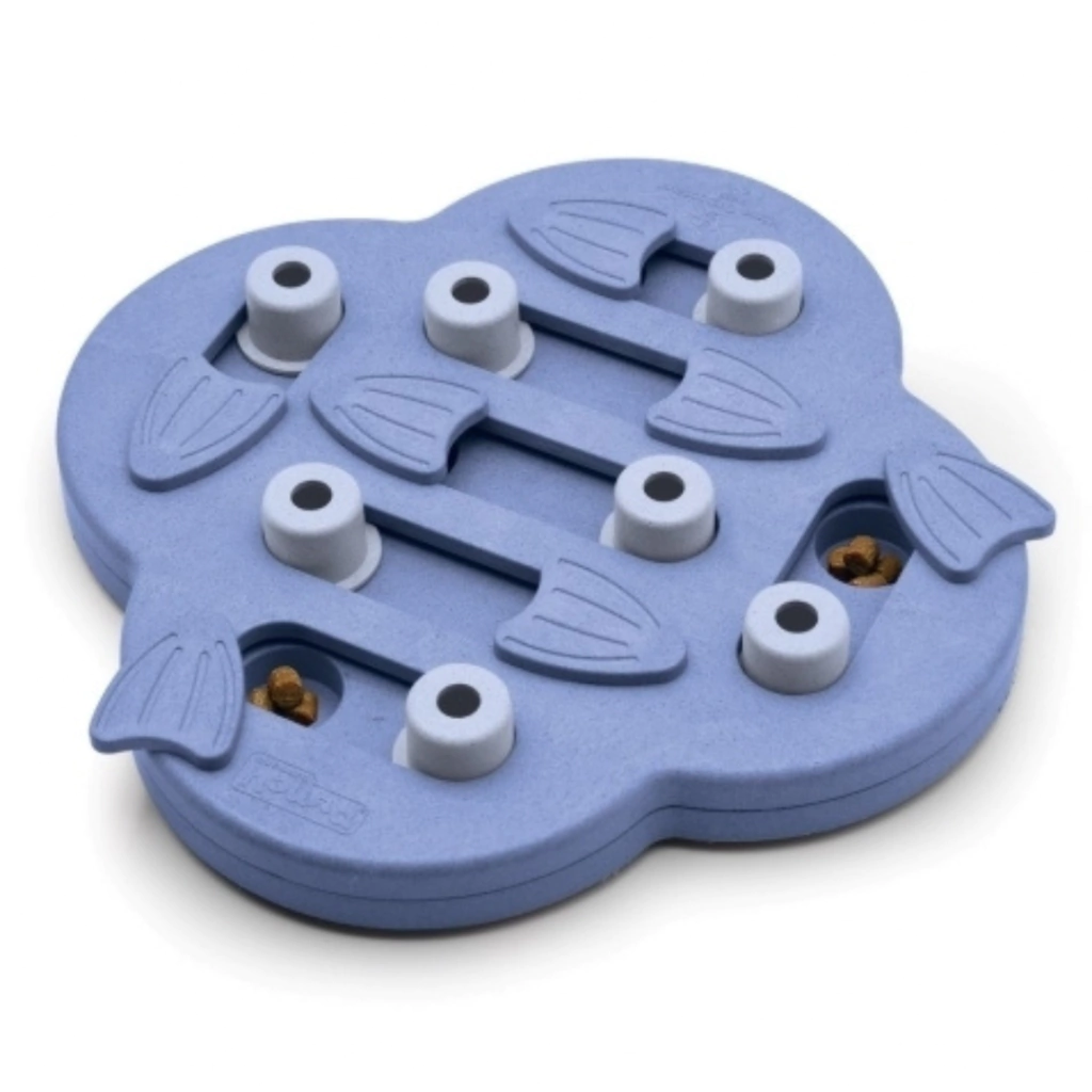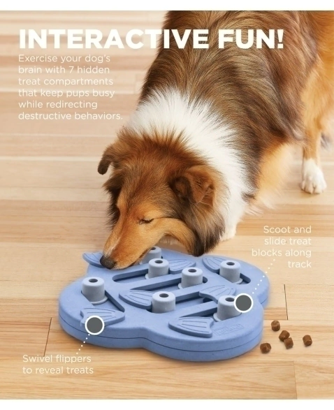 Modo de usar: 1 – Coloque petiscos ou ração nos blocos circulares e compartimentos na base. 2 – Gire os flippers para cobrir as trilhas. 3 – Que comecem os jogos! Coloque o jogo no chão e estimule seu cão a procurar pelos petiscos.