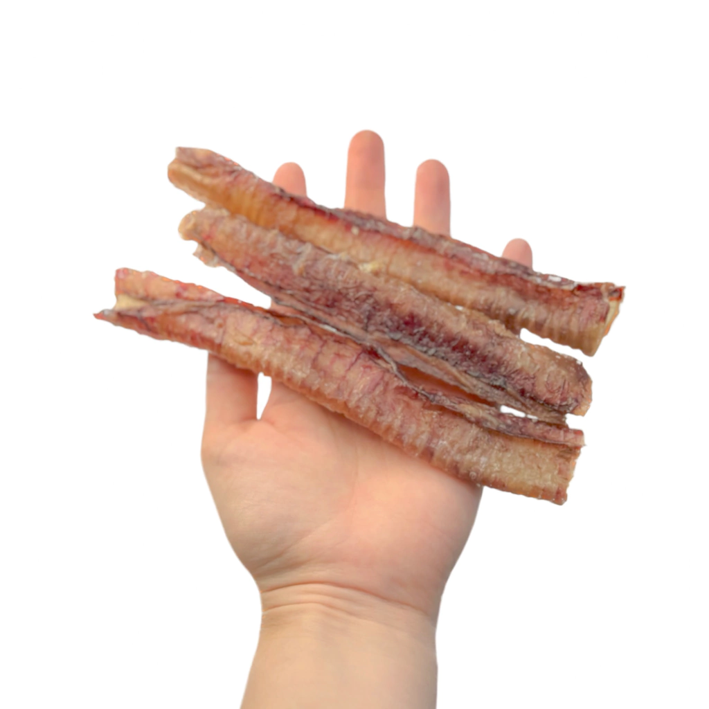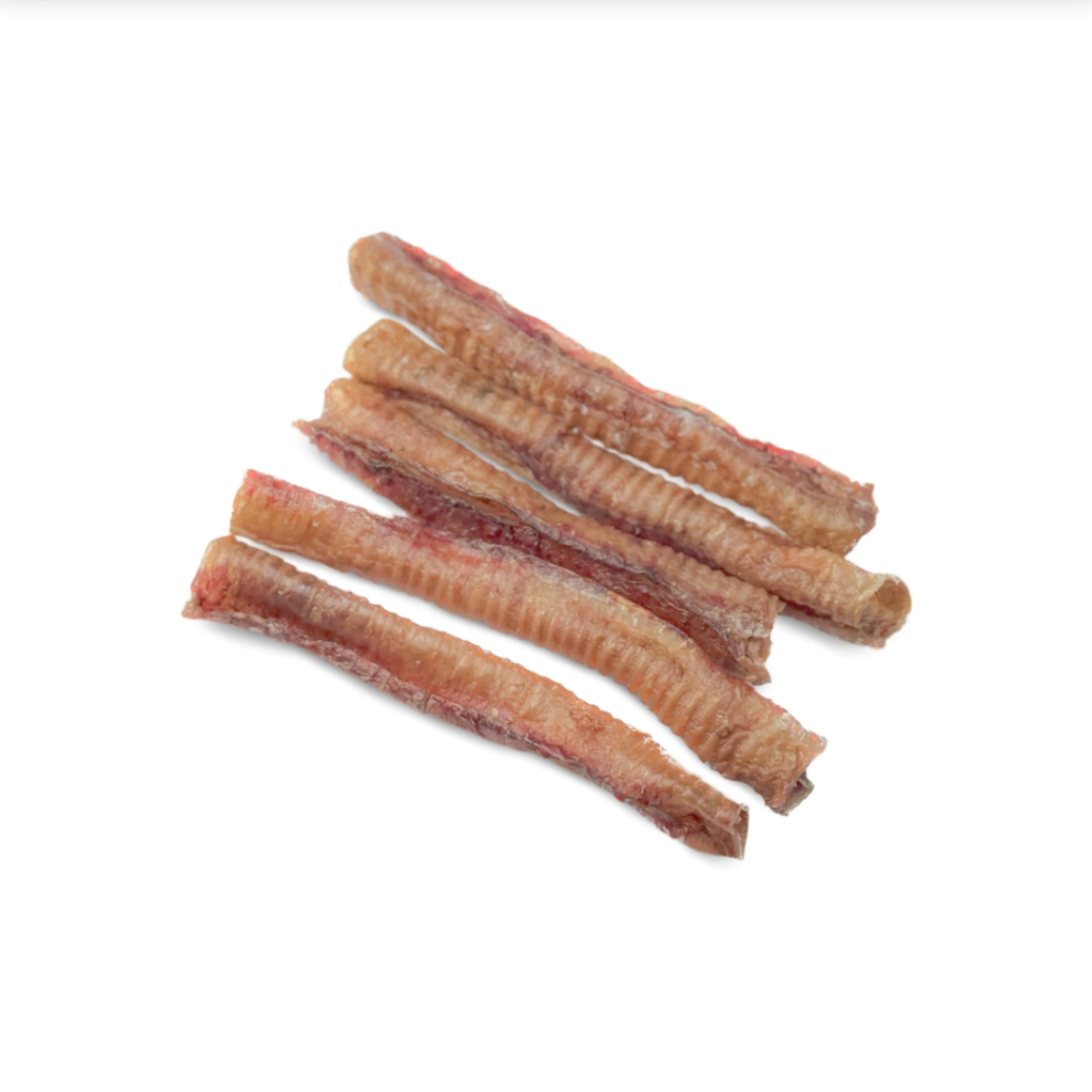 Descrição Contém 100g (de 8 a 12 unidades) de Traqueia Ovina (9cm aproximadamente) desidratados lentamente em baixa temperatura. Produto fabricado artesanalmente, não possui adição de conservantes e corantes, 100% natural. Pode ser oferecido como recompensas positivas e enriquecimento ambiental, é um mastigável desidratado ótimo para auxilio e prevenção de tártaro. Benefícios: A traqueia é feita de cartilagem, naturalmente rica em glucosamina e crondroitina, benéfica para as juntas e saúde dos cães. Dificuldade: Fácil; Apropriado para cães saudáveis de todos os tamanhos. Observação: Produto natural, possui variação de tamanhos, formatos e cores.