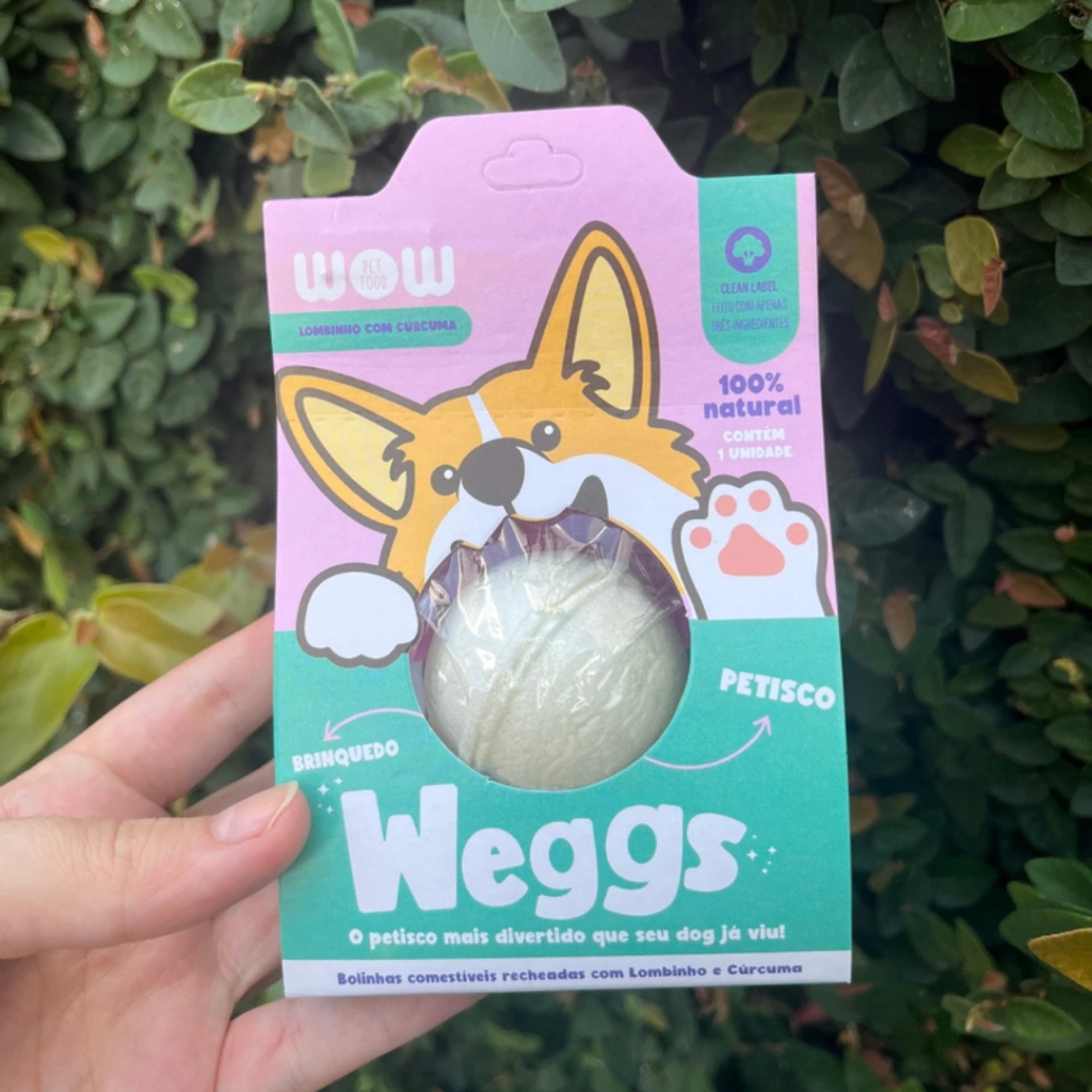 O petisco mais divertido que o seu dog já viu! Brincar comendo ou comer brincando? Com o Weggs ambas as opções são possíveis. O Weggs é uma bolinha comestível recheada com lombinho com cúrcuma desidratado, 100% natural, livre de conservantes, corantes, palatabilizantes artificiais e aditivos químicos. Matéria prima 100% brasileira. Ingredientes: Lombinho suíno desidratado e fécula de mandioca. Pode conter agrião ou couve (cor verde).